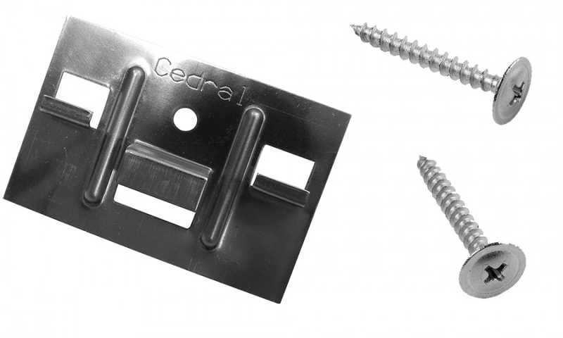 Комплект "Кляммер+Винт" это металлическое изделие из нержавеющей стали, применяется для скрытого крепления фиброцементного сайдинга Cedral Click.